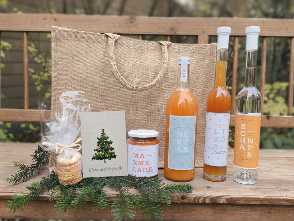 Unser Marillen-Quartett bestehend aus Nektar, Schnaps, Likör und Marmelade kommt in einer nachhaltigen Jute-Tragetaschen mit einigen weihnachtlichen Überraschungen.